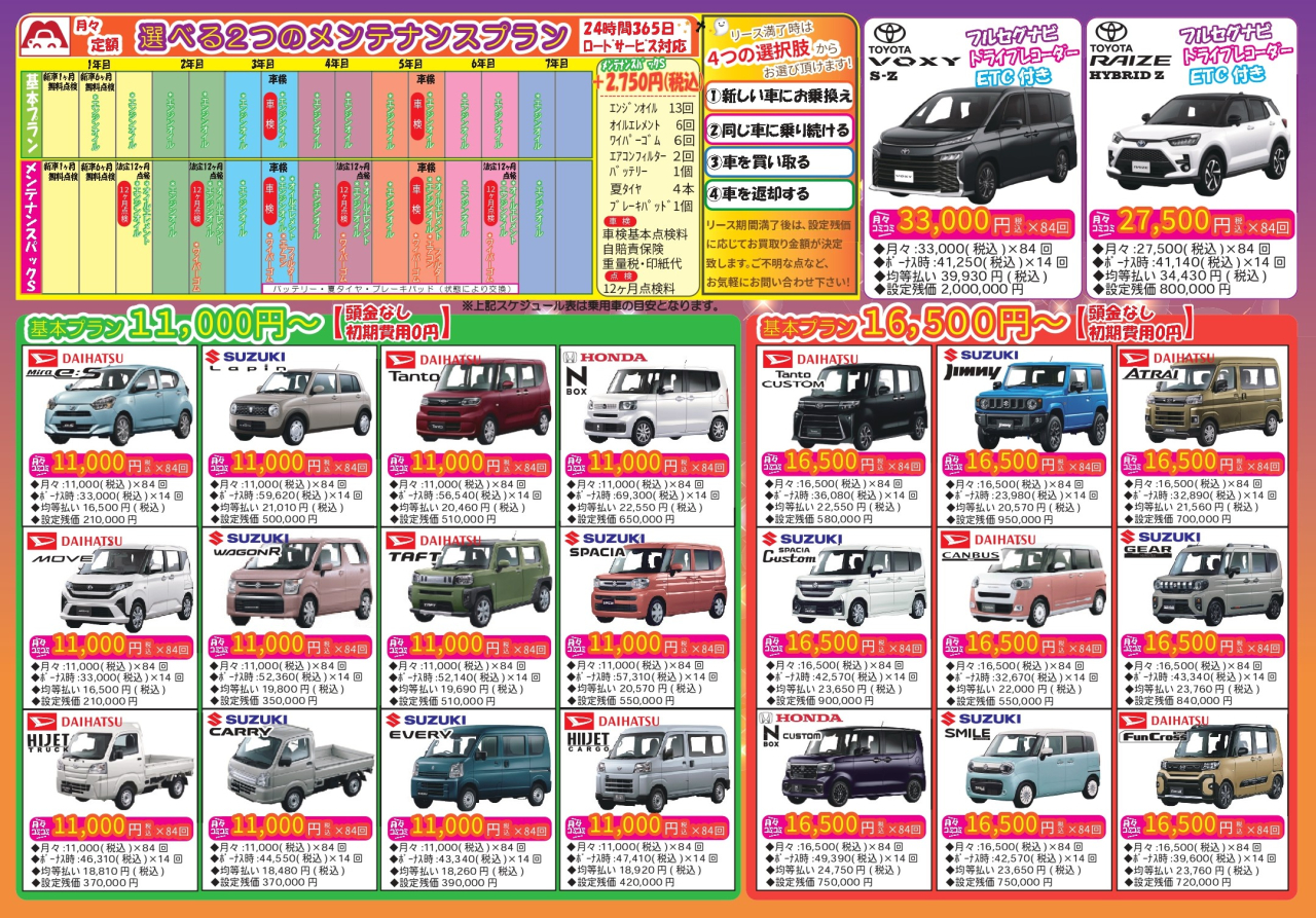 さらに、頭金や初期費用は不要となります。新車は買いたいけどまとまった費用が・・・とお考えの方も是非当店へご相談ください。カーリースなら契約期間、月々のお支払い、初期費用、お車のグレードなどお客様のそれぞれのライフスタイルに合ったご提案をいたします。基本プランにも車検(重量税、自賠責保険含む)や毎年の自動車税、オイル交換(年2回)も月々のお支払にコミコミです!